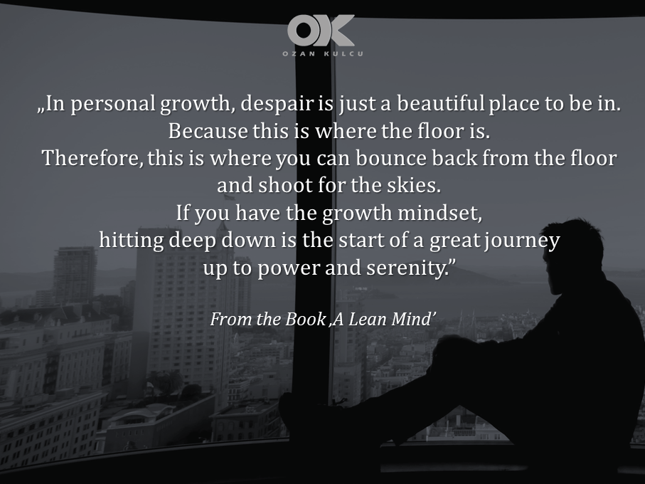 “In personal growth, despair is just a beautiful place to be in. Because this is where the floor is. Therefore, this is where you can bounce back from the floor and shoot for the skies. If you have the growth mindset, hitting deep down is the start of a great journey up to power and serenity.